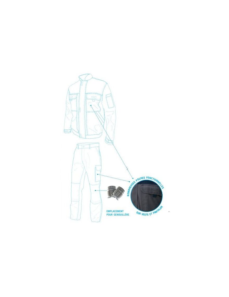 Ce pantalon de travail est équipé d'une braguette fermée par fermeture glissière nylon. Ceinture élastiquée dans le dos, boutonnière de réglage à l'intérieur de la ceinture. 2 poches italiennes,1 poche téléphone. 1 poche avec 2 soufflets côtés sur cuisse gauche avec fermeture rabat velcro. 1 double poche mètre «porte-outils »sur cuisse droite. 1 accroche marteau. 1 poche dos rabat velcro. 1 pince dos. 2 poches genouillères Cordura® Noir (2 positions de hauteur de mousse+ fermeture velcro sur toute la largeur) - Entrejambe 82 cm.