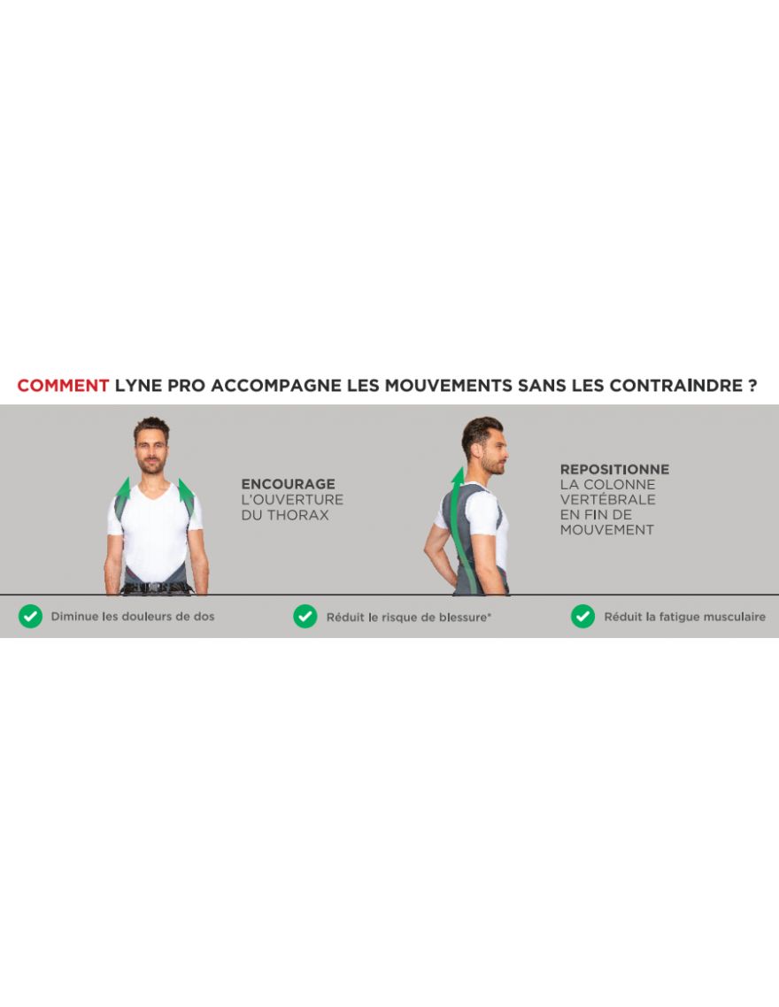 La ceinture lombaire est curative et ne doit intervenir que sur de courtes périodes ou en cas de pathologie. Elle empêche certains mouvements à risque. Alors que le LYNE PRO encourage à conserver une bonne posture en permanence. Il n'empêche pas les mouvements et n'a aucune contre-indication.